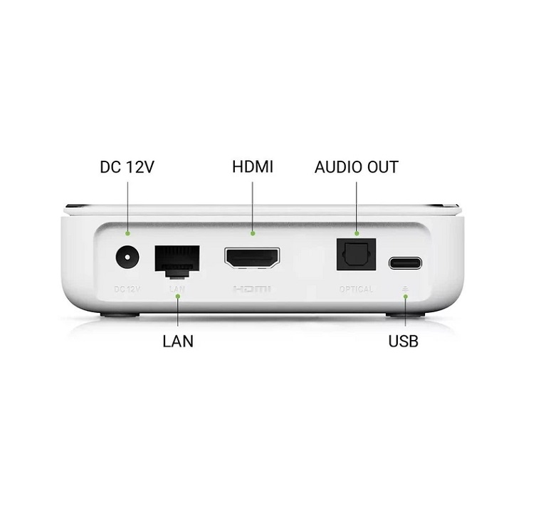 Google TV 12, Amlogic S905X4 Quad Core ARM Cortex-A53 (1.91 ГГц) + Mali-G31 MP2, 4 ГБ DDR4 RAM, внутренняя память 32 ГБ eMMC, Wi-Fi AX, Bluetooth 5.0, HDMI 2.1, USB 2.0 Type-A, USB 3.0 Type-A, Ethernet 1000 Мбит/с, голосовое управление, 114x114x28 мм, 700 г