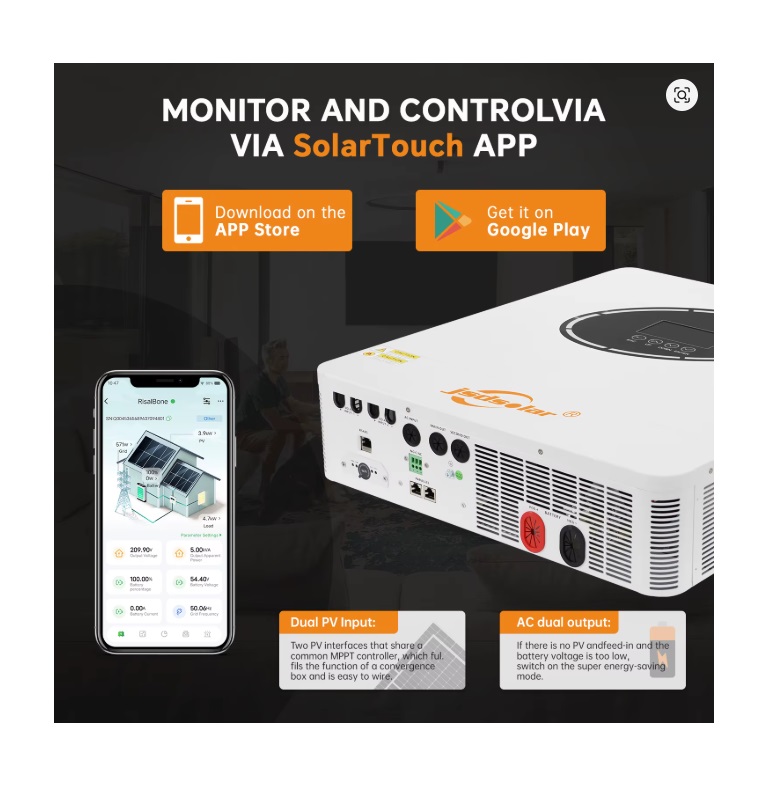Инвертор с чистой синусоидой, зарядное устройство до 160А (до 160А от солнечного поля 7500W×2), напряжение аккумулятора 48 В (lithium-ion, LiFePO4, AGM, Gel, EFB – Enhanced Flooded Battery), входящее напряжение от солнечного поля 60-500В, выходная мощность: номинальная - 12000 Вт, пиковая - 24000 Вт, 230В +/-5% (90-280VAC), чистая синусоида, 6.25" дисплей, сигнализация низкого заряда 22В ± 0,5В,отключение 48В±0,5В, сигнализация высокого заряда 54В ± 0,5В, отключение при превышении 63В ± 0,5В, защита от короткого замыкания, от перегрева, от перегрузки, от повышенного напряжения, активное охлаждение, рабочая температура -10°C to 60°C, 594*500*210 мм, 15 кг