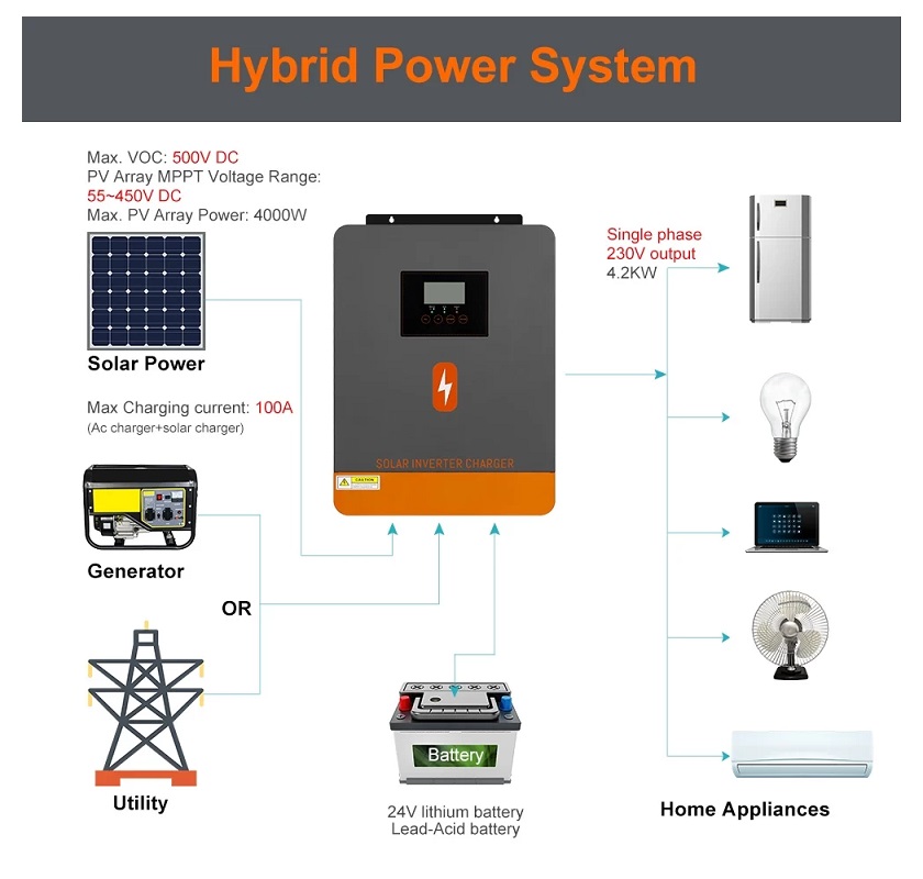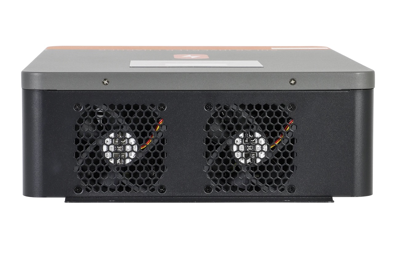 Инвертор с чистой синусоидой, зарядное устройство до 100А (до 100А от солнечного поля), напрядение аккумулятора 12/24 В (lithium-ion, LiFePO4, AGM, Gel, EFB – Enhanced Flooded Battery), входящее напряжение от солнечного поля 55-500В, выходная мощность: номинальная - 2300 Вт/4200 Вт, пиковая - Вт, 220В +/-5%, чистая синусоида, 6.25" дисплей, сигнализация низкого заряда 22В ± 0,5В, отключение 21В±0,5В,сигнализация высокого заряда 32В ± 0,5В, отключение при превышении 33В ± 0,5В, защита от короткого замыкания, от перегрева, от перегрузки, от повышенного напряжения, активное охлаждение, рабочая температура -10°C to 55°C, 405x305x108 мм, 6.7 кг