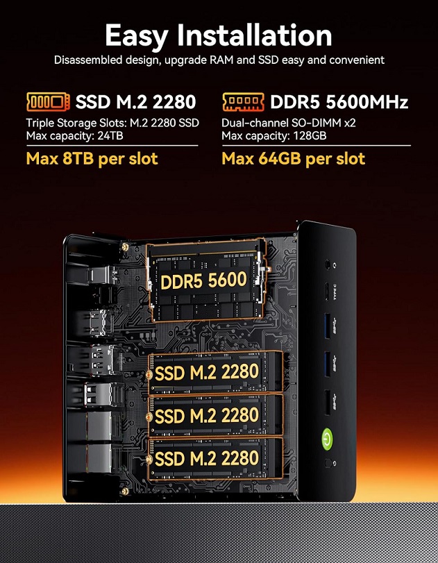 AMD Ryzen 7 H 255 (3.8 - 4.9 ГГц) 8 ядер/16 потоков, 16Gb RAM DDR5 5600 MT/S, 1Tb SSD NVMe, PCIe 4.0 3*M.2 2280 SSD NVMe. MAX (2* PCIe4.0x2/ 1* PCIe4.0x4) 8TB*3=24TB, AMD Radeon 780M (12Core 2600 MHz), WiFi 6E, Bluetooth 5.2, 2x2.5GLan, Quad Display Output, HDMI 2.1 (8K@120HZ), DP1.4 (8K@120HZ), 2xType-C (PD/DP/Data)*1, Oculink (PCI-e 4x4), 5xUSB-A, аудио комбинированый разъем, Windows 11, VESA, 154*151*73.6 мм