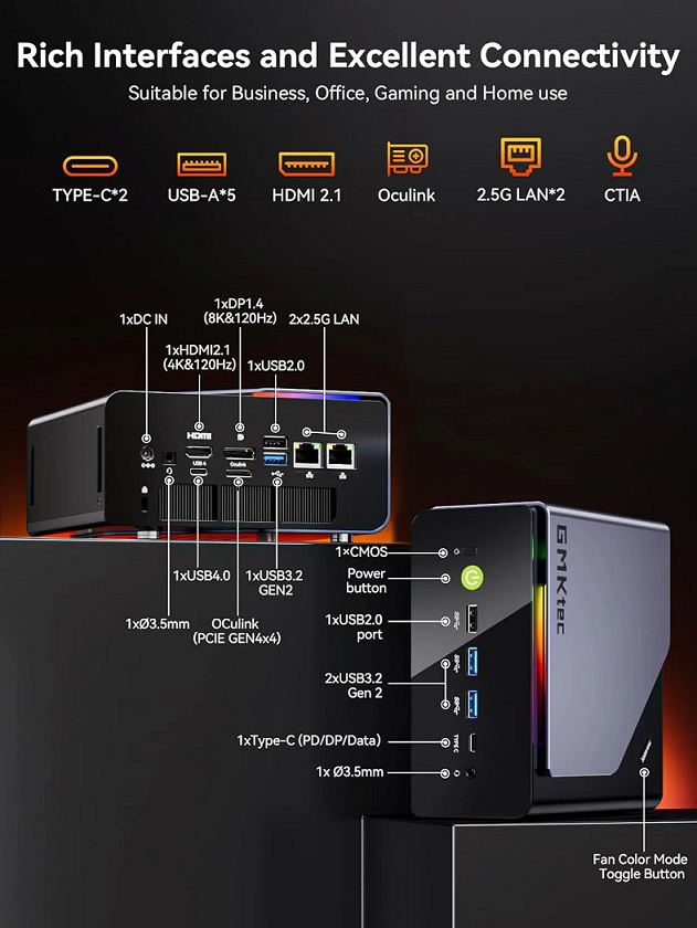 AMD Ryzen 7 H 255 (3.8 - 4.9 ГГц) 8 ядер/16 потоков, 32Gb RAM DDR5 5600 MT/S, 1Tb SSD NVMe, PCIe 4.0 3*M.2 2280 SSD NVMe. MAX (2* PCIe4.0x2/ 1* PCIe4.0x4) 8TB*3=24TB, AMD Radeon 780M (12Core 2600 MHz), WiFi 6E, Bluetooth 5.2, 2x2.5GLan, Quad Display Output, HDMI 2.1 (8K@120HZ), DP1.4 (8K@120HZ), 2xType-C (PD/DP/Data)*1, Oculink (PCI-e 4x4), 5xUSB-A, аудио комбинированый разъем, Windows 11, VESA, 154*151*73.6 мм