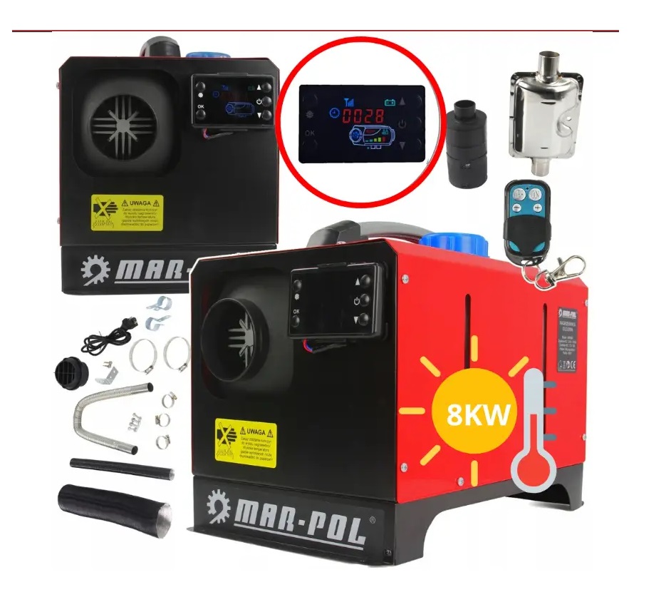 Дизель. Мощность: 8000 Вт. Питание 220В, дисплей, термостат, терморегулятор, пульт ДУ, вентилятор, датчик уровня топлива, ручка для переноски, 41х31х25 см, 10 кг
