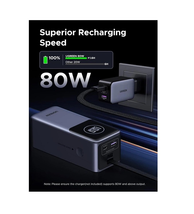 Li-Pol, встроенный кабель Type-C (100W) 20см, USB Type-C (30W), USB Type-A (33W), до 100 Вт на одно устройство, зарядка павербанка до 80Вт, Quick Charge 4.0+, Power Delivery 3.1, Huawei Fast Charge Protocol (FCP), Samsung Adaptive Fast Charging (AFC), 131x54x51 мм, 520 г