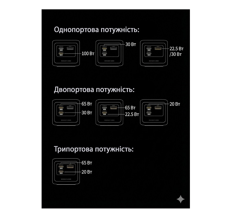 Li-Pol, 2x USB Type-C (100W), USB Type-A (22.5W), до 100 Вт на одно устройство, зарядка павербанка до 65Вт, Quick Charge 4.0+, Power Delivery 3.1, Huawei Fast Charge Protocol (FCP), Samsung Adaptive Fast Charging (AFC), 121x54x50 мм, 455 г