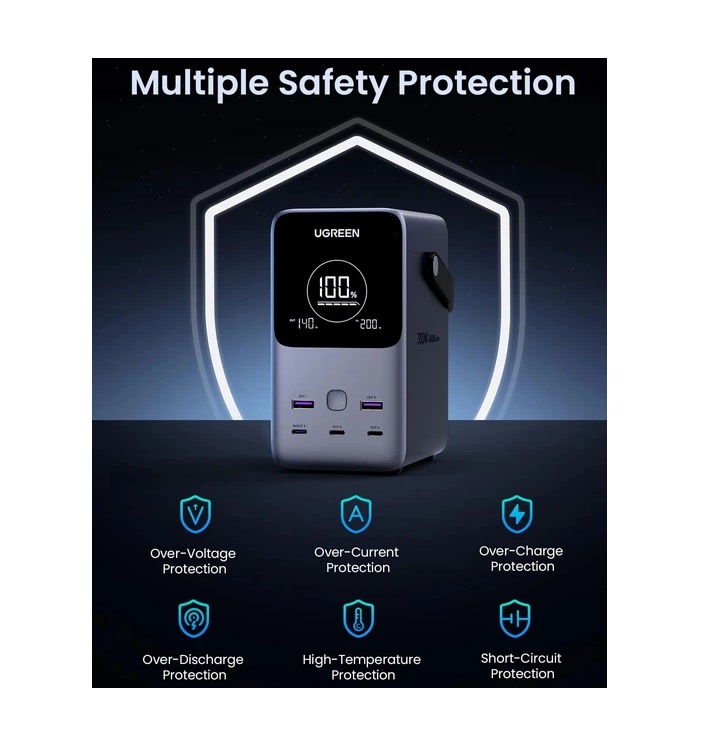 LiFePO4, 3x USB Type-C, 2x USB Type-A, до 140 Вт на одно устройство (общая - до 300 Вт), Quick Charge 3.0, Power Delivery 3.0, Huawei Fast Charge Protocol (FCP), Samsung Adaptive Fast Charging (AFC), 160x145x77 мм, 1637 г
