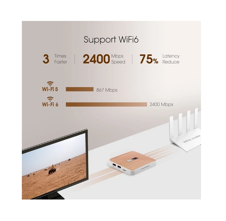 Android 11, Amlogic S905X4 Quad Core ARM Cortex-A53 (1.91 ГГц) + Mali-G31 MP2, 4 ГБ DDR4 RAM, внутренняя память 64 ГБ eMMC, Wi-Fi AX, Bluetooth 5.0, HDMI, USB 2.0 Type-A, USB 3.0 Type-A, Ethernet 10/100/1000 Мбит/с, поддержка microSD, голосовое управление