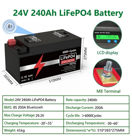 Аккумулятор, LiFePO4, 24 В, BMS с контролем через Bluetooth, 240 Ач, 6144 Вт*ч, буферный режим 29.2 В, циклический режим 29.2 В, максимальный ток 200 A, 6000+ циклов (при глубине разряда 100%), рабочий диапазон разряда от -30°C до +60°C (заряд от -20°C до +55°C), 510x265x275 мм, 45кг