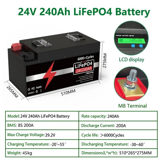 Аккумулятор, LiFePO4, 24 В, 240 Ач, 6144 Вт*ч, буферный режим 29.2 В, циклический режим 29.2 В, максимальный ток 200 A, 6000+ циклов (при глубине разряда 100%), рабочий диапазон разряда от -30°C до +60°C (заряд от -20°C до +55°C), 510x265x275 мм, 45кг