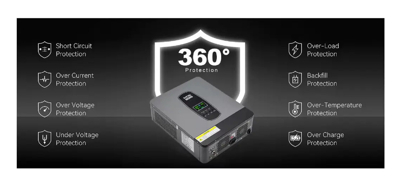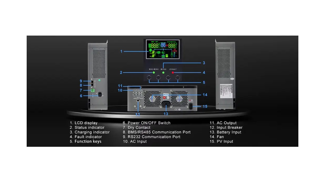 Инвертор с чистой синусоидой, зарядное устройство до 60А (до 100А от солнечного поля), напрядение аккумулятора 24 В (lithium-ion, LiFePO4, AGM, Gel, EFB – Enhanced Flooded Battery), входящее напряжение от солнечного поля 40-500В, выходная мощность: номинальная - 3000 Вт, пиковая - Вт, 230В +/-5%( ), чистая синусоида, 6.25" дисплей, сигнализация низкого заряда 22В ± 0,5В,отключение 1В±0,5В, сигнализация высокого заряда 29В ± 0,5В, отключение при превышении 32В ± 0,5В, защита от короткого замыкания, от перегрева, от перегрузки, от повышенного напряжения, активное охлаждение, рабочая температура 0°C to 55°C, 560*390*195 мм, 7.5 кг