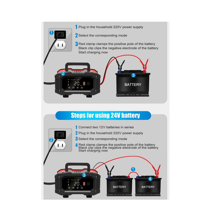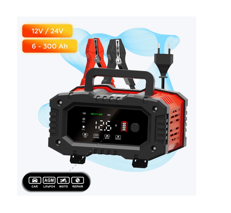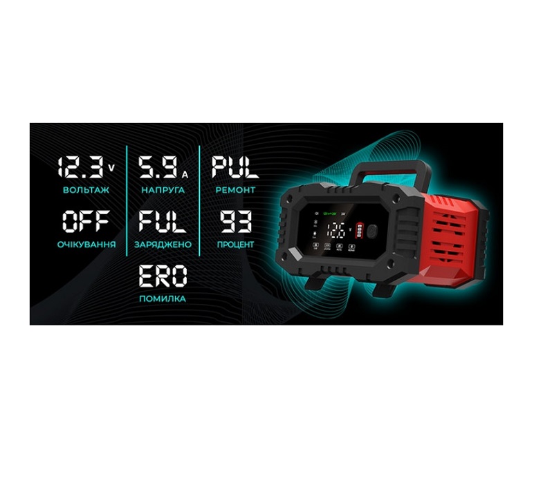 для автомобильного аккумулятора (GEL/LiFePO4, SLA, WET, EFB, Calcium), 12V - 20А, 24V - 10A, АКБ 10-300 Ач, импульсное автоматическое 7-ступенчатое, встроенный амперметр, индикатор заряда, защита от короткого замыкания/от перегрева/от перегрузки/от перезаряжания