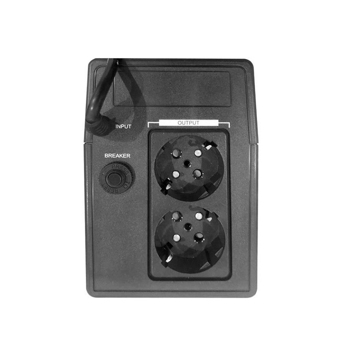 600 BA, 360 Вт, резервный (Off-Line), 140-295 В, аппроксимированная синусоида, время перехода на батареи меньше 10 мс, выходное напряжение 230 В, 2 розетки, время работы от батареи до 15 минут, время зарядки 10 ч, 100x280x145 мм, 4.8 кг