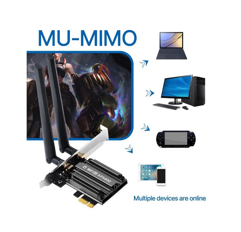 PCI-E, MT7922, Triple Band 2.4Ghz-574Мбит/с/5Ghz-2400Мбит/с/6Ghz-2400Мбит/с, 2.4G & 5G/6G, 802.11n,802.11a/g,802.11ac, 802.11ax, Bluetooth 5.3