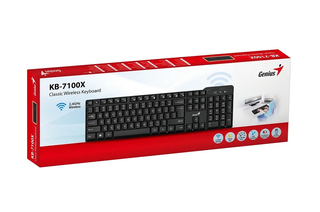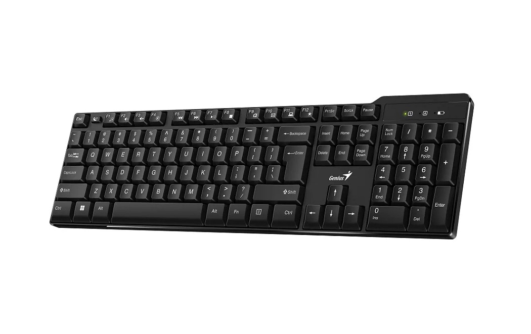 USB, беспроводная (радиоканал), мембранная, 104 клавиши, индикатор заряда, защита от воды, 1xAA, черная