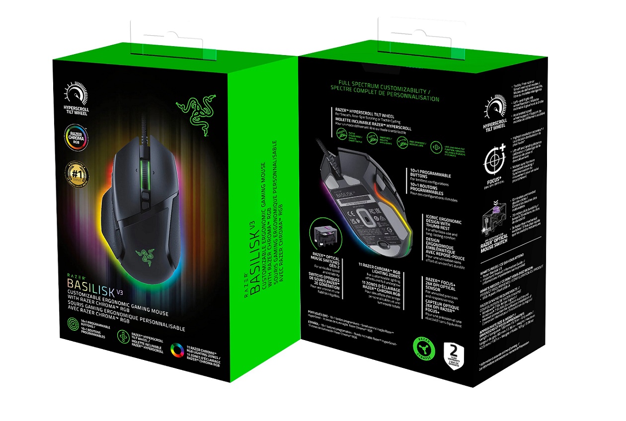 11 кнопок, Razer Focus+, 26000 dpi, RGB подсветка, синхронизация подсветки Razer Chroma, встроенная память, 101 г, 130х60х43 мм