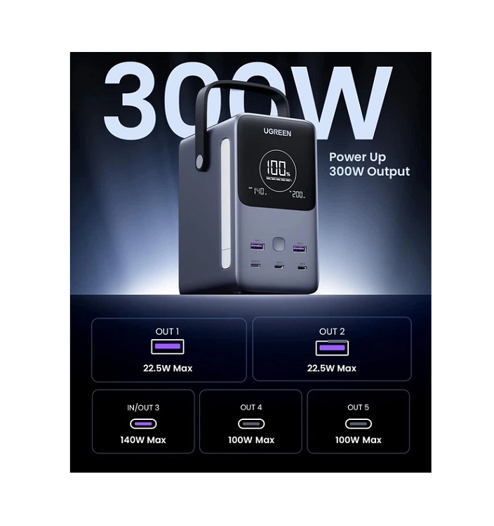 LiFePO4, 3x USB Type-C, 2x USB Type-A, до 140 Вт на одно устройство (общая - до 300 Вт), Quick Charge 3.0, Power Delivery 3.0, Huawei Fast Charge Protocol (FCP), Samsung Adaptive Fast Charging (AFC), 160x145x77 мм, 1637 г